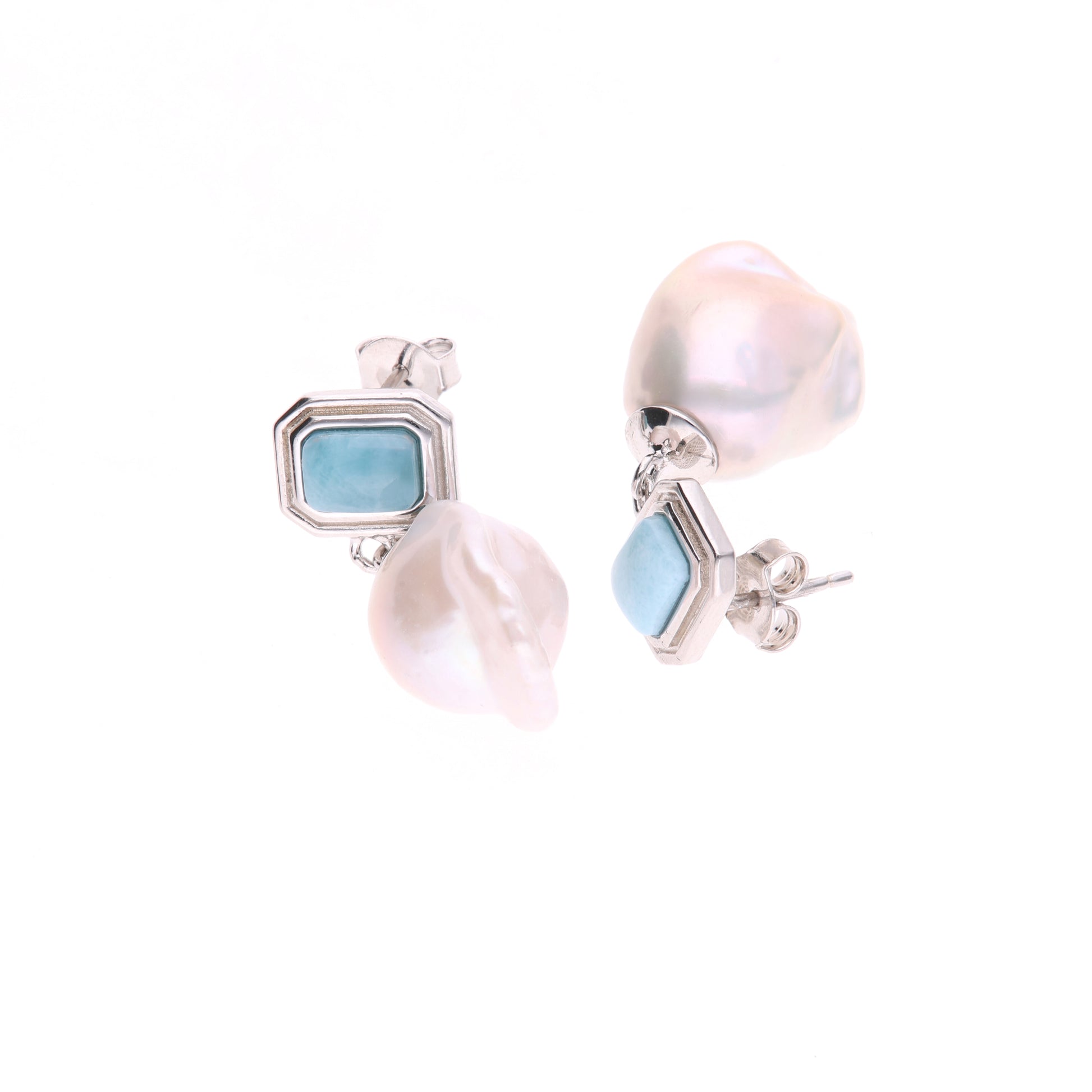 Aretes elaborados en plata .925 con combinación de larimar natural y elementos complementarios. Su diseño original ofrece contraste y estilo, ideal para quienes buscan una joya distinta y moderna.