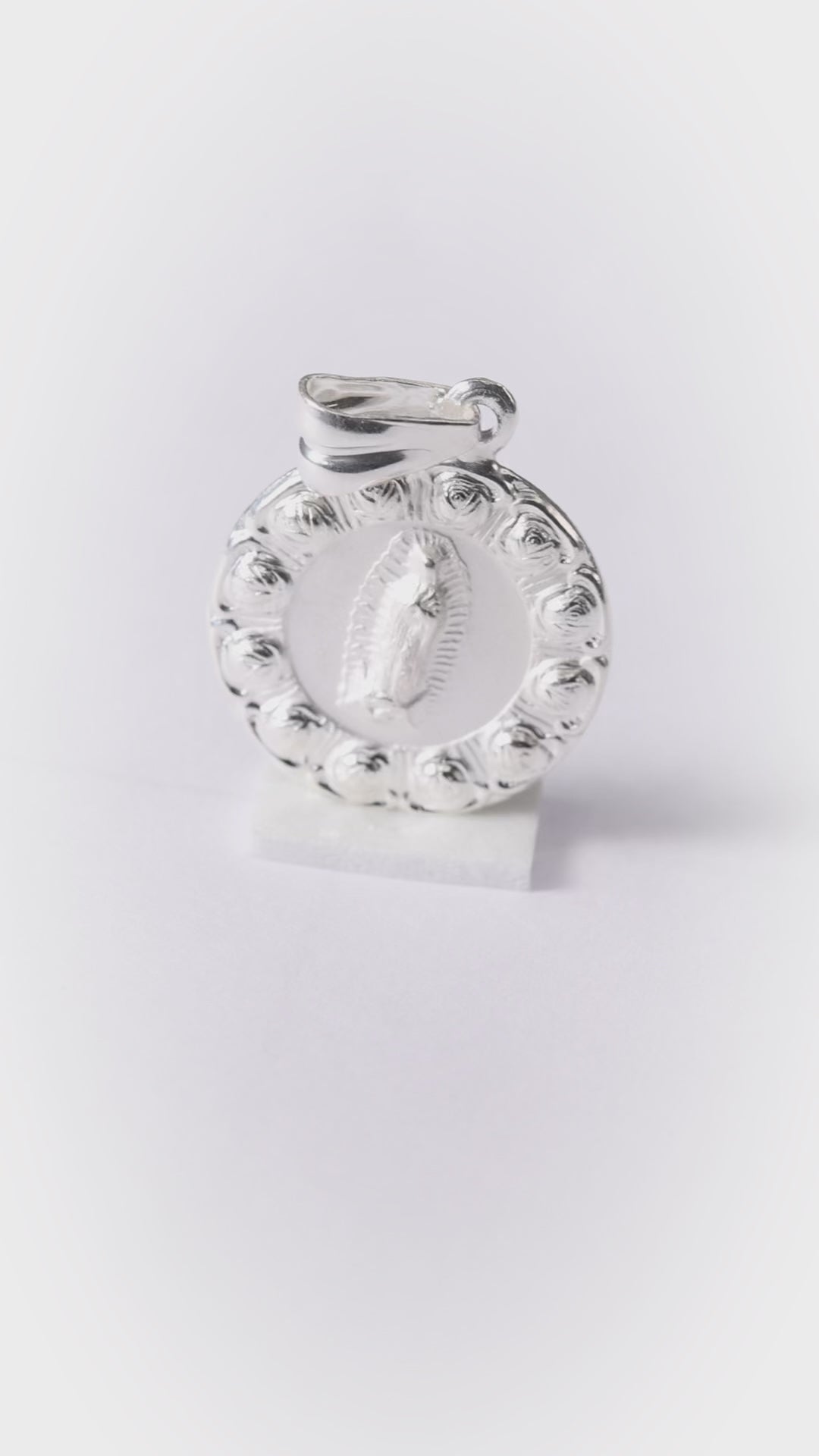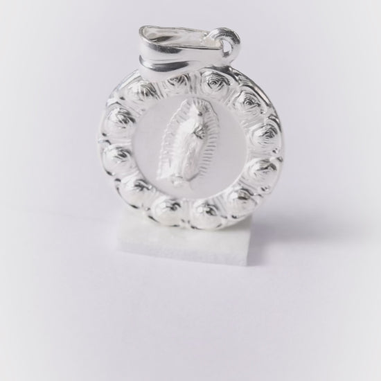 Elaborado artesanalmente en auténtica plata de ley con técnicas de grabado y relieve que capturan la esencia de la Virgen de Guadalupe.