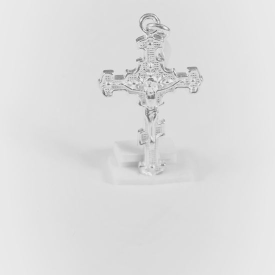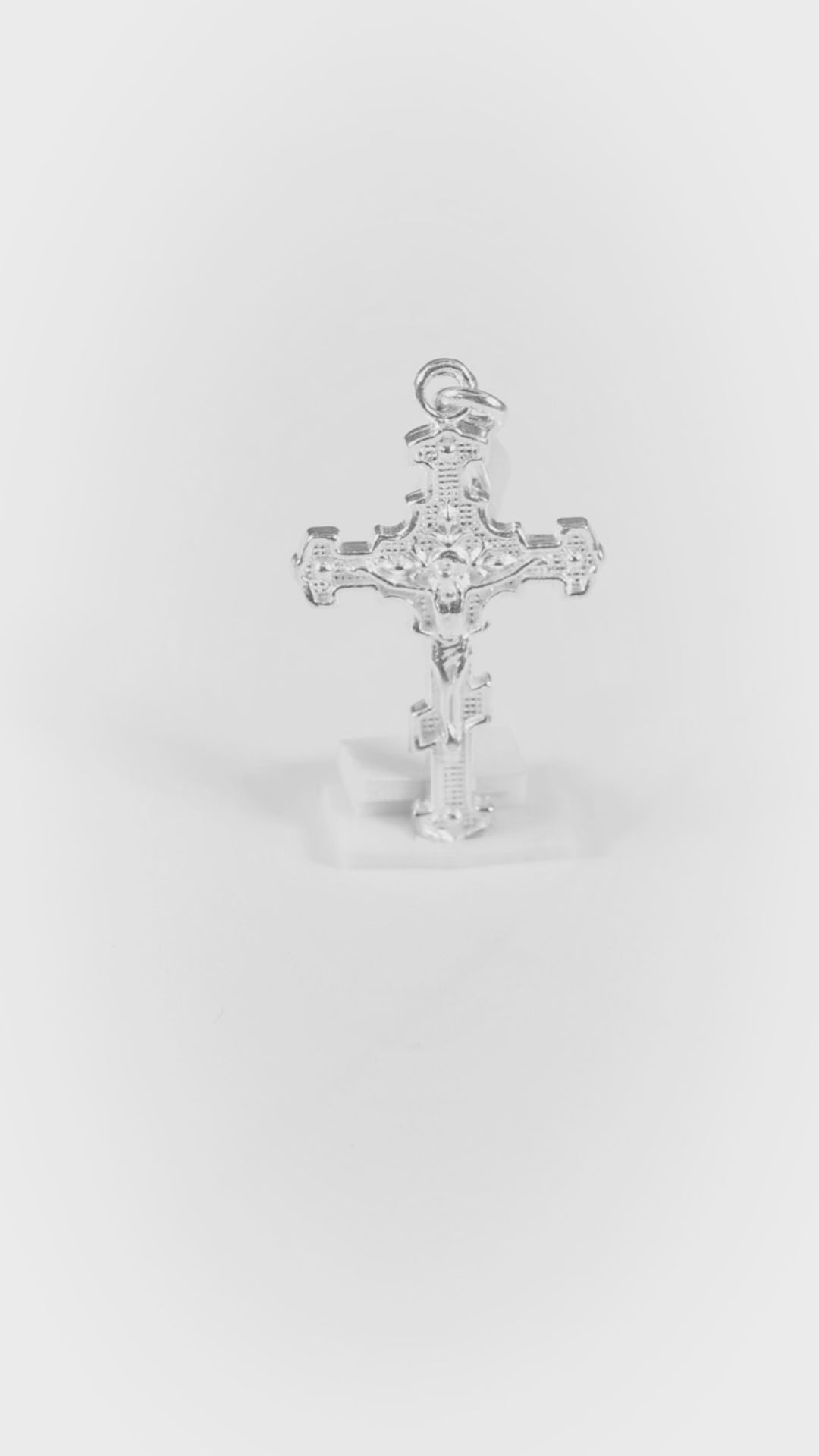Extraordinaria representación de la cruz ortodoxa bizantina, símbolo sagrado de la tradición cristiana oriental que evoca la rica herencia espiritual del Imperio Bizantino y la profundidad teológica de la Iglesia Ortodoxa. Esta pieza única destaca por su diseño tradicional que presenta la cruz con tres travesaños característicos: el superior que representa el letrero INRI, el central donde fueron clavadas las manos de Cristo, y el inferior inclinado que simboliza el apoyo para los pies, creando una representación completa y teológicamente significativa de la crucifixión. Los detalles ornamentales bizantinos no solo aportan belleza visual excepcional sino que también representan la riqueza litúrgica y la profundidad espiritual de la tradición ortodoxa, simbolizando la conexión entre lo terrenal y lo divino, la continuidad de la fe apostólica y la magnificencia de la adoración bizantina. Es perfecta para quienes buscan una pieza religiosa que honre la tradición ortodoxa oriental y desean conectar con la herencia espiritual milenaria del cristianismo bizantino, ideal tanto para la oración diaria como para celebraciones litúrgicas especiales donde la tradición ortodoxa es valorada. Su diseño equilibrado y simbolismo teológico la convierten en una pieza distintiva que mantiene su profundo significado espiritual mientras celebra la rica herencia bizantina. Elaborado artesanalmente en auténtica plata de ley con técnicas que respetan la iconografía ortodoxa tradicional y honran la precisión teológica de los símbolos sagrados.