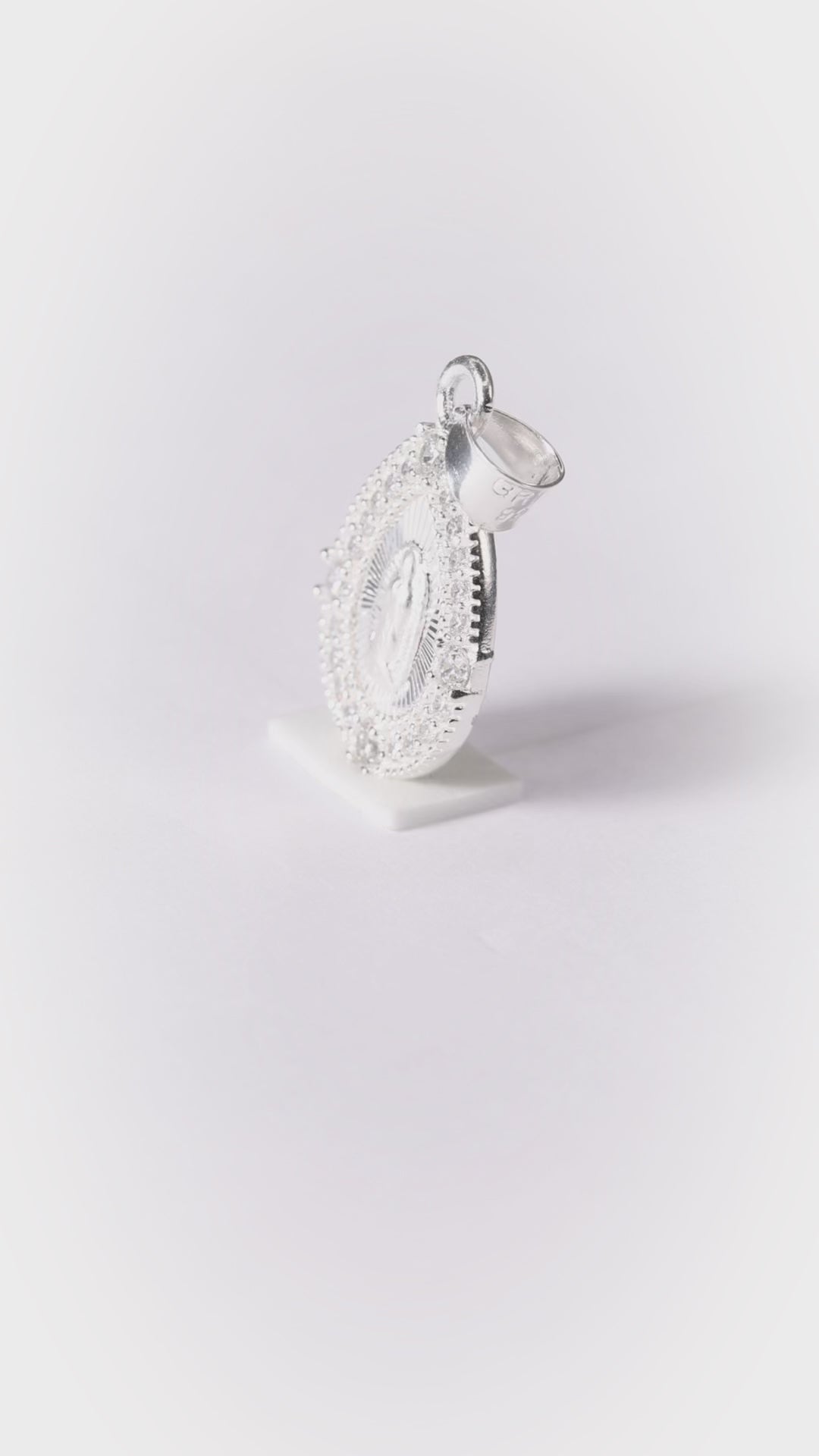 - Diseño: Imagen grabada de la Virgen de Guadalupe con resplandor divino de zirconias